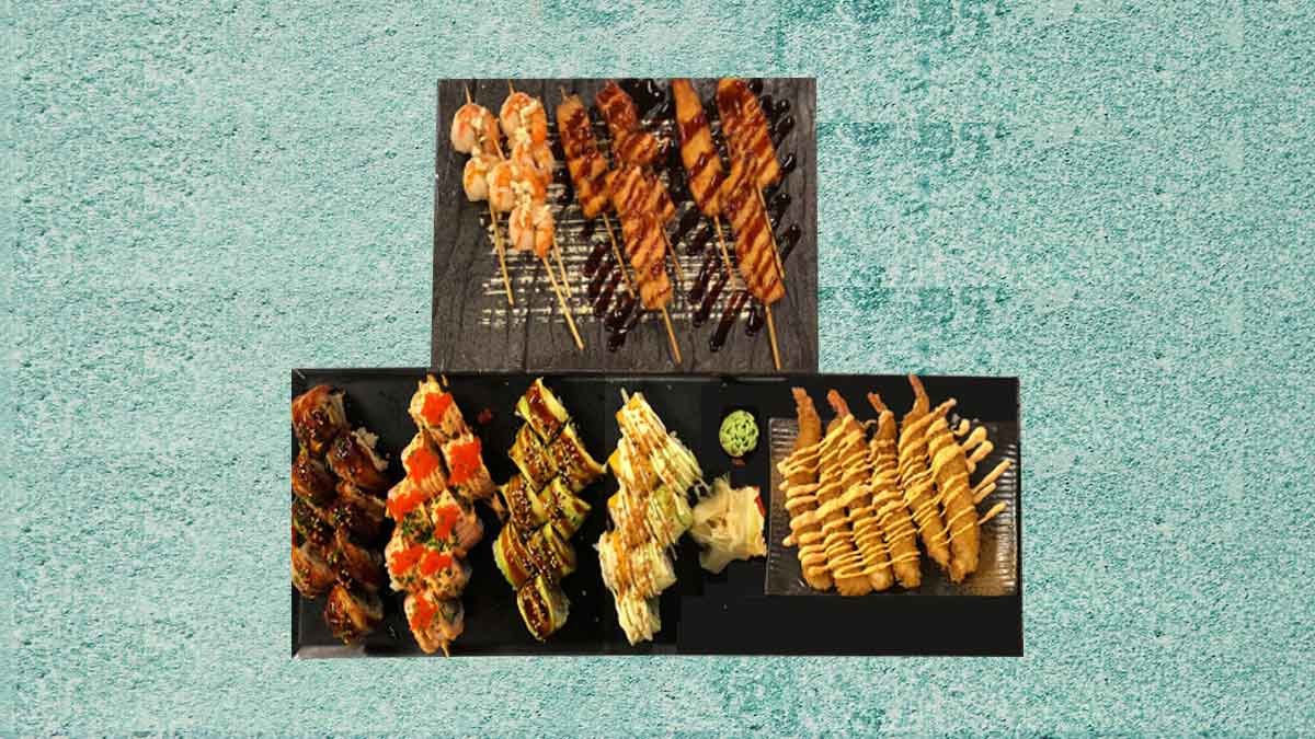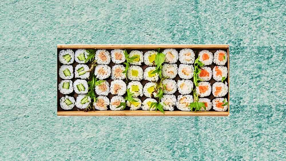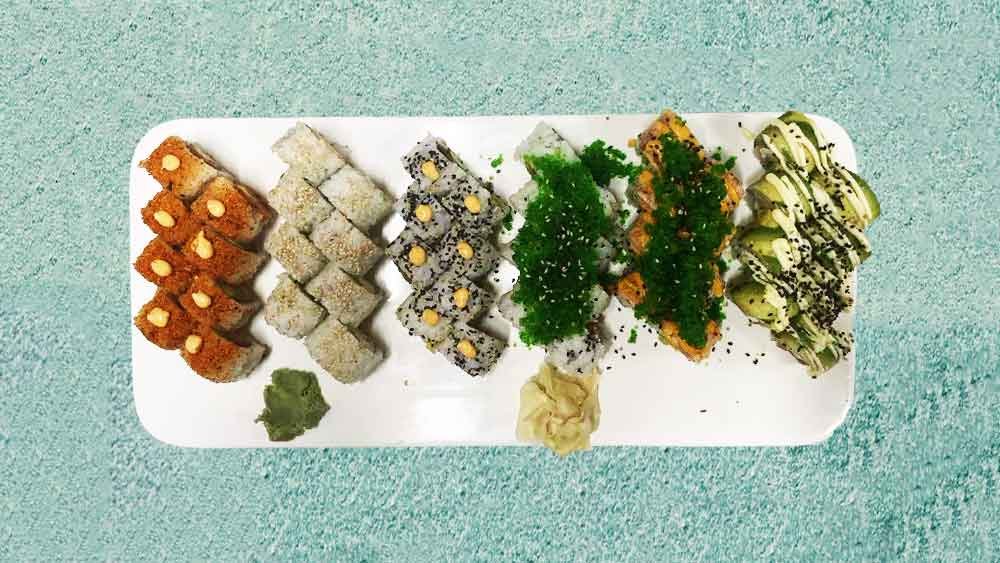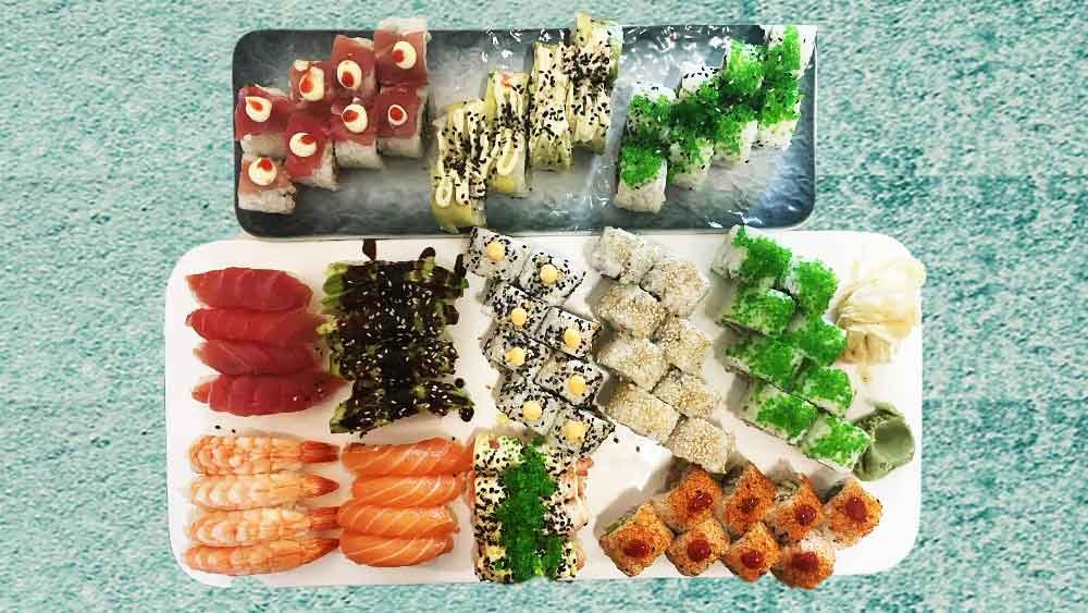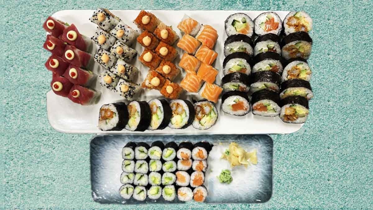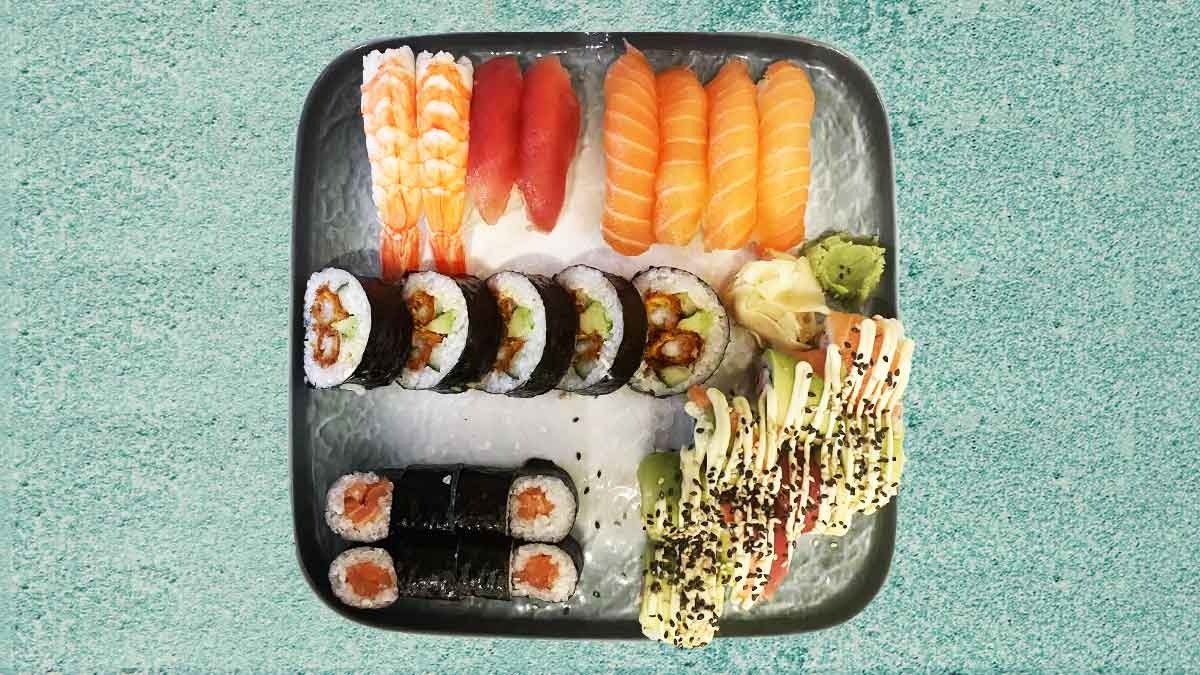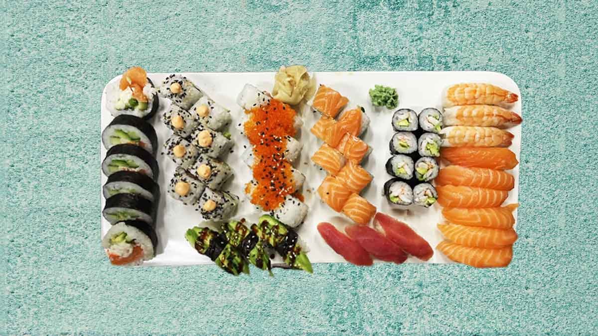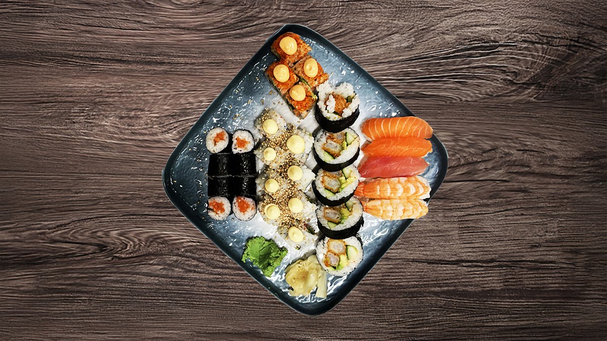 5 stk Ebi tempura ,8 stk california roll ,8stk Hosomaki laks ,4 stk spciy laks ,5 stk Nigiri 2 laks 2 rejer 1 tun