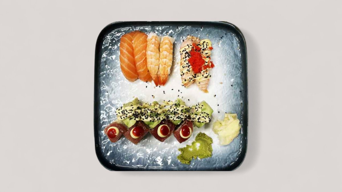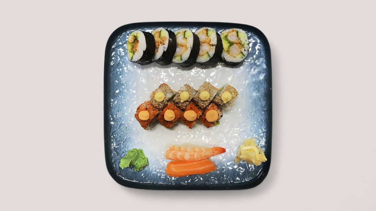 5 stk Ebi tempura ,4 California roll ,4 stk spicy laks ,2 stk nigiri 1 laks 1 rejer