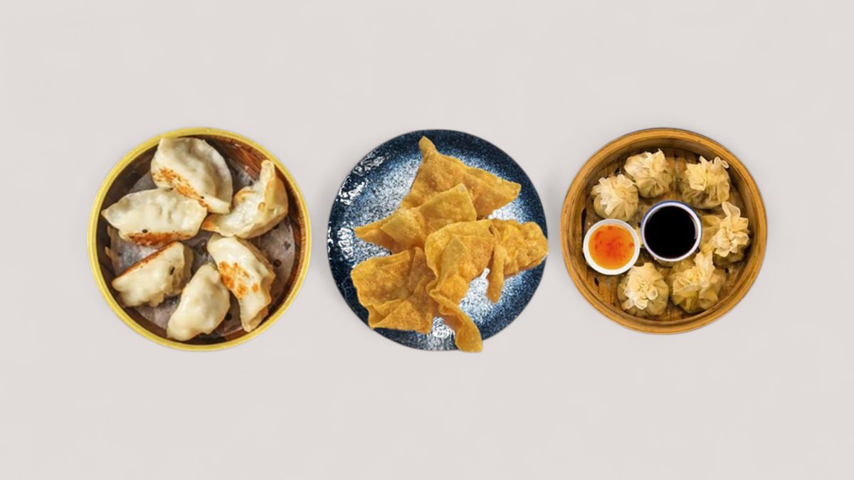 6 stk Guotie med kylling (pan-stegt dumplings) 6 stk Dampede siu mai 6 stk Indbagte wonton serveres med soja sauce og sweet chili sauce