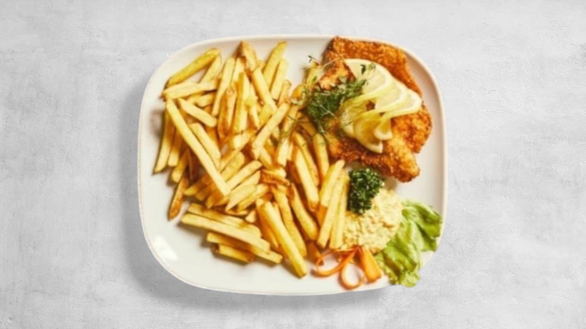 Nuggets, pommes frites, iceberg, agurk, tomat, ketchup og remoulade.