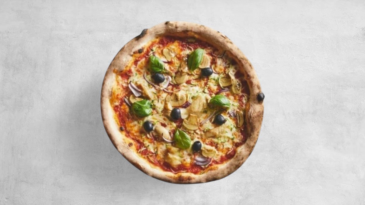 Tomatsauce, mozzarella, kebab, løg, champignon og rød peberfrugt.