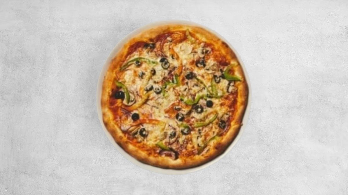 Pizzasauce, løg, champignon, oliven, mozzarella, peberfrugt, majs.