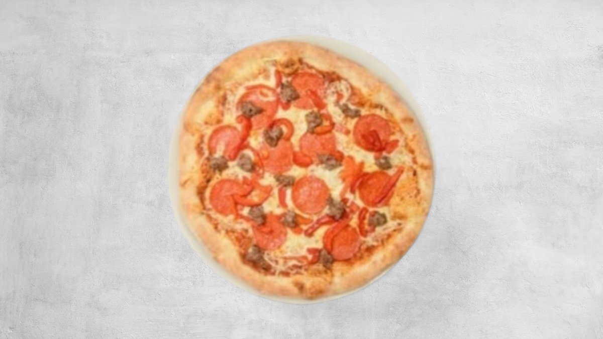 Tomatsauce, mozzarella, skinke, pepperoni, okse og rød peberfrugt.