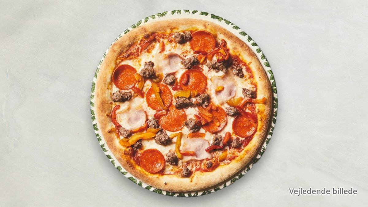 Tomatsauce, ost, skinke, pepperoni, oksekød og peberfrugt.