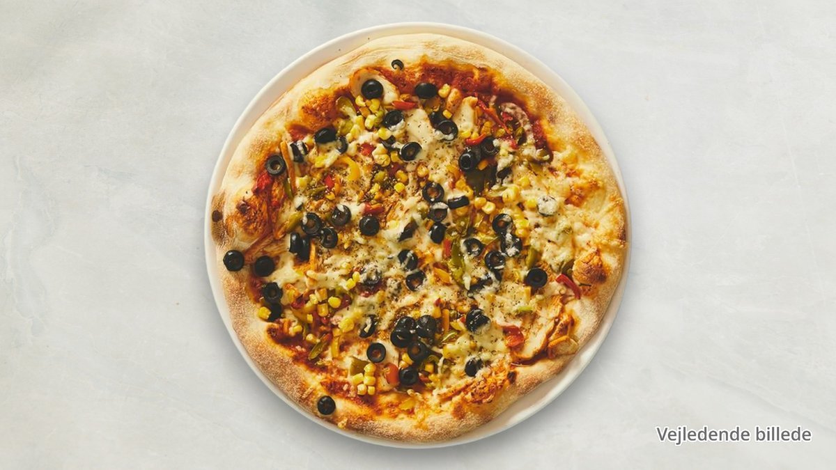 Tomatsauce, ost, kylling, oliven og peberfrugt.