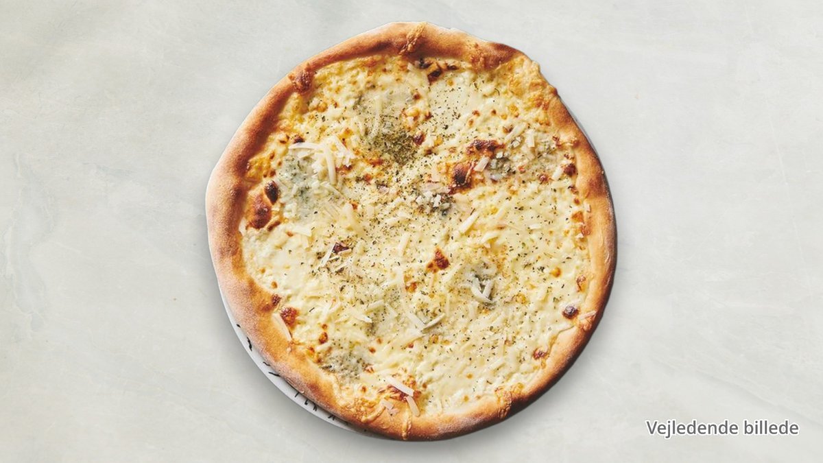Tomatsauce, ost, parmigiano, gorgonzola og pesto.