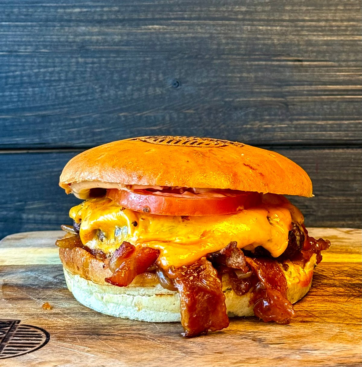 200 gram flammegrillet bøf, dobbel ost, bacon, karameliseret løg, tomat, Røget barbeque sauce, husets dressing. Serveres med en valgfri side, pommes frites og en valgfri dåsesodavand.