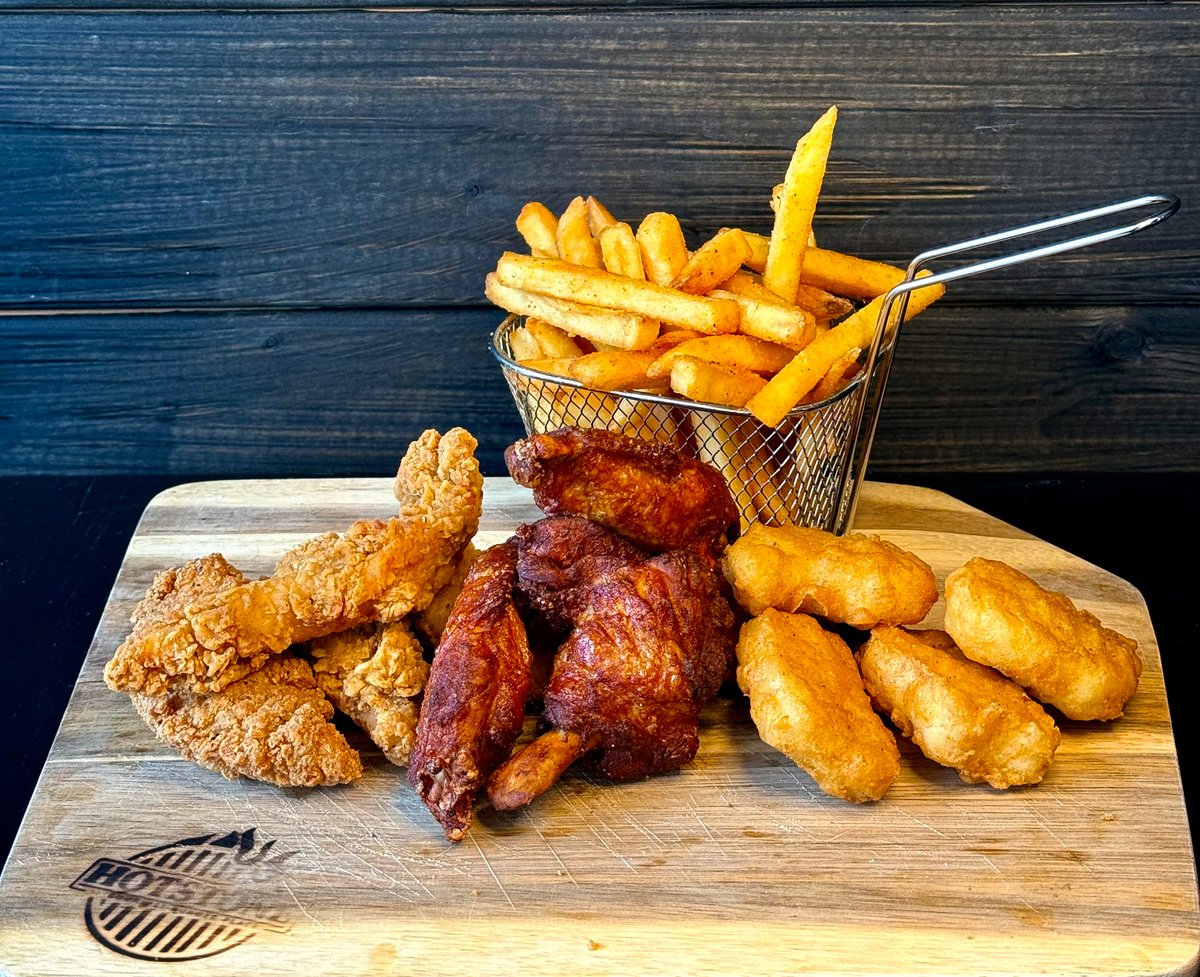 4 x Hotwings 4 x Nuggets 4 x Chicken Strips Serveres med valgfri dip, pommes og valgri sodavand.