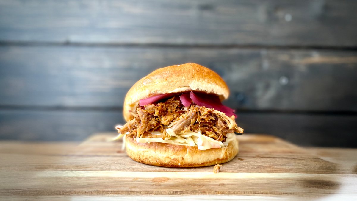langsomt kogt pulled pork, coleslaw barbecuesauce, og syltede rødøg.