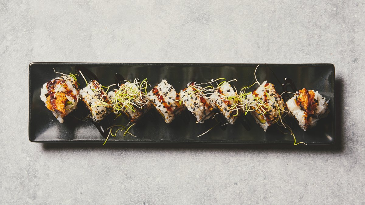Tempura reje, avocado, spicy dip, toppet med sesam, teriyaki, spirer