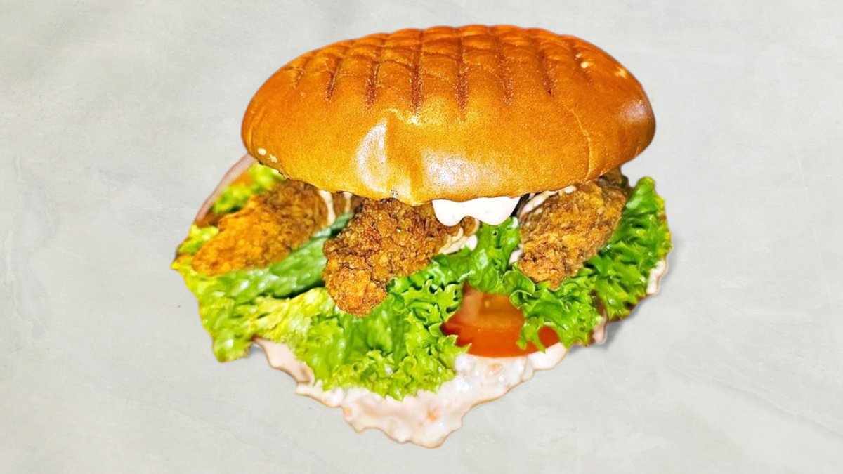 Hjemmelavet crispy chicken, med tomat, pickles, rødlig, salat, hjemmelavet dressing. Serveres med pommes frites og valgfri sodavand