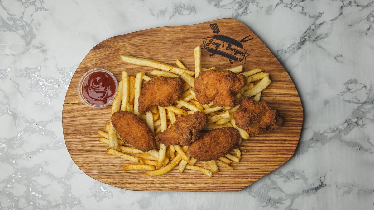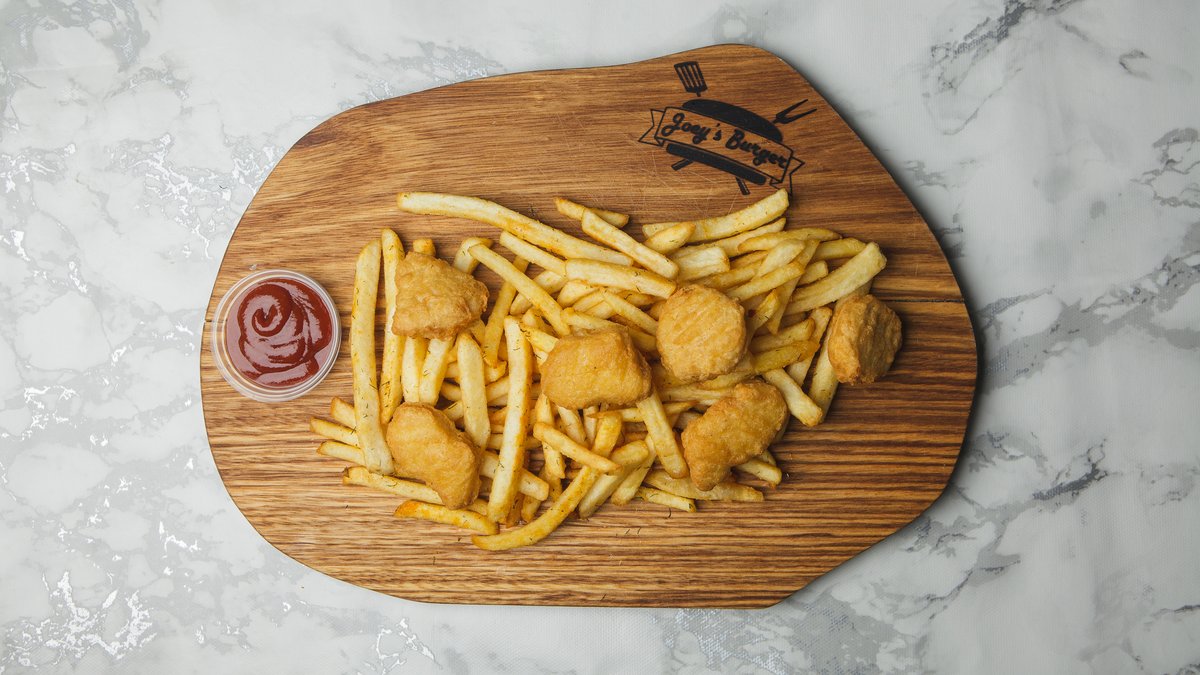 Nuggets med pommes frites, pommes frites sauce og ketchup. Serveres med sodavand