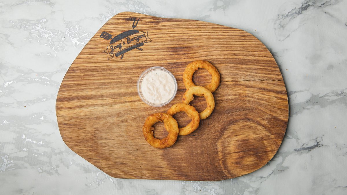 Oksekød (120 g), bacon, cheddar, BBQ-sauce & sprøde løgringe.