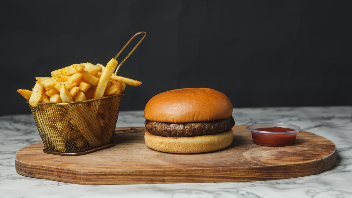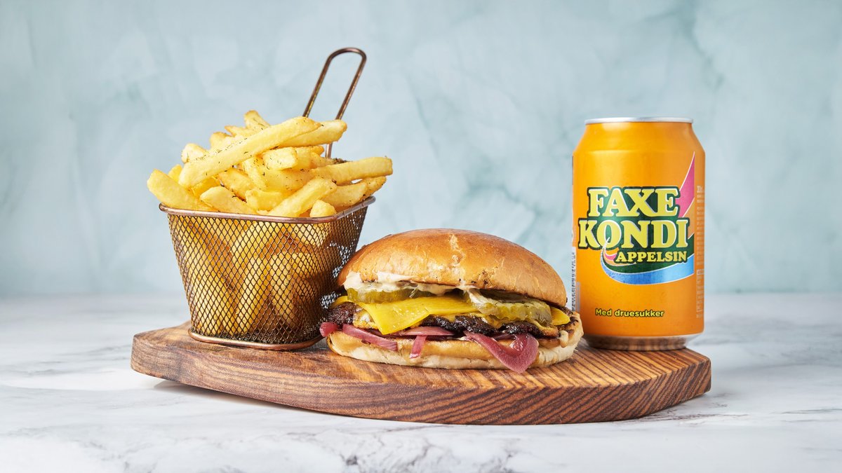Enkelt bøf (120 g), cheddar, salat, tomat, løg, pickles & dressing. Serveres med pommes frites og valgfri sodavand.
