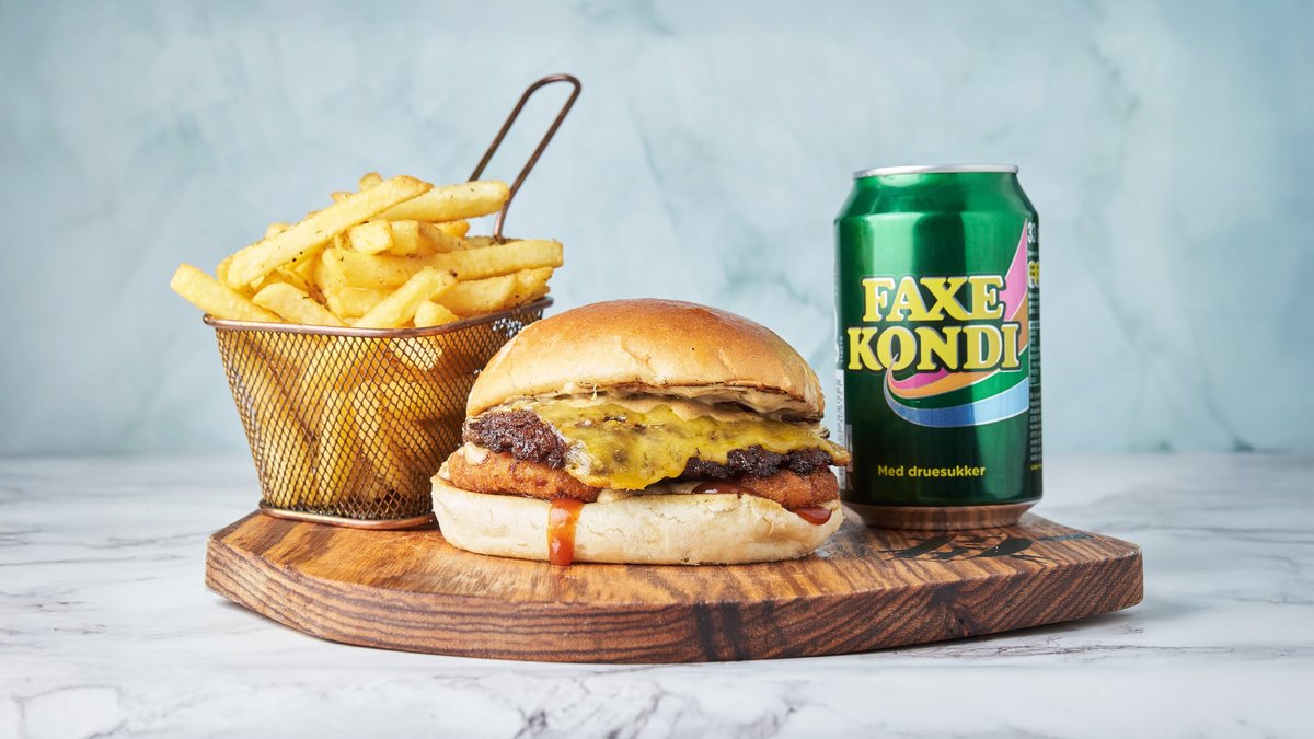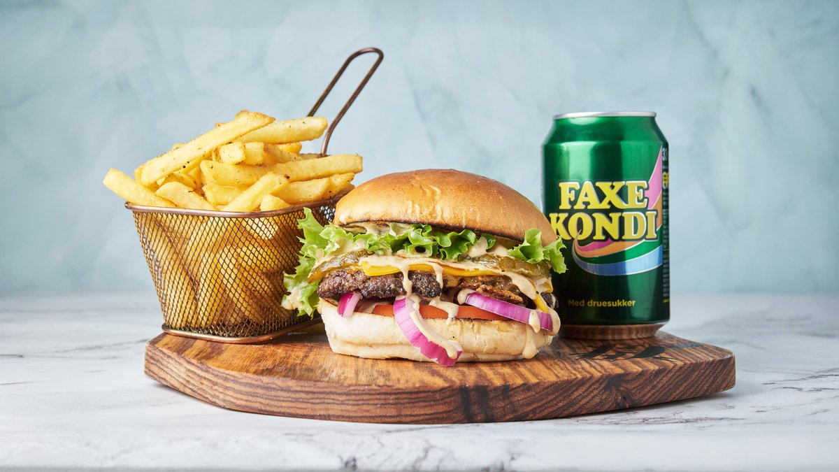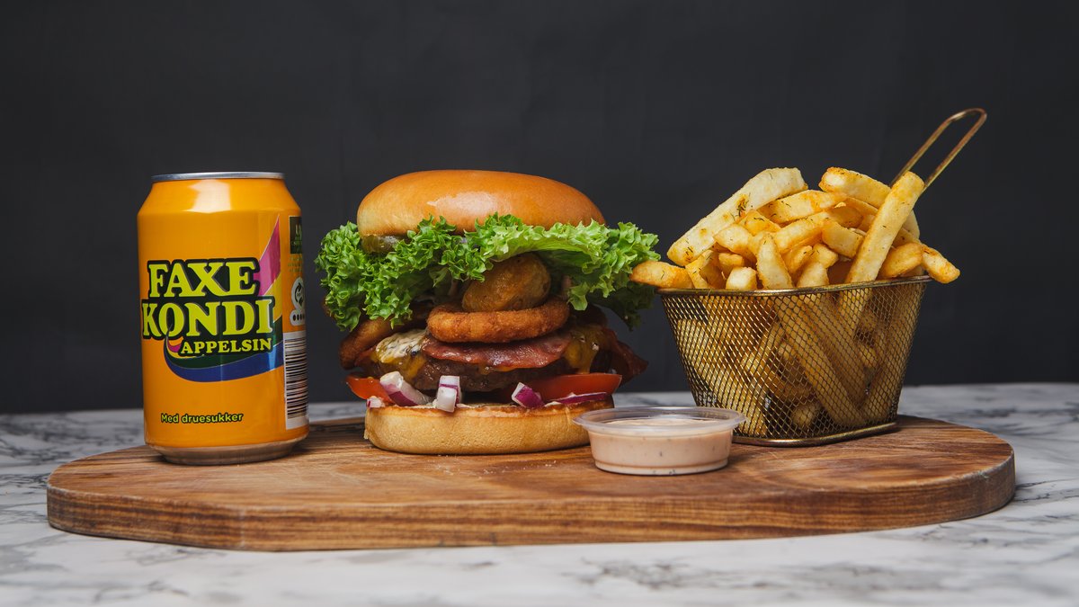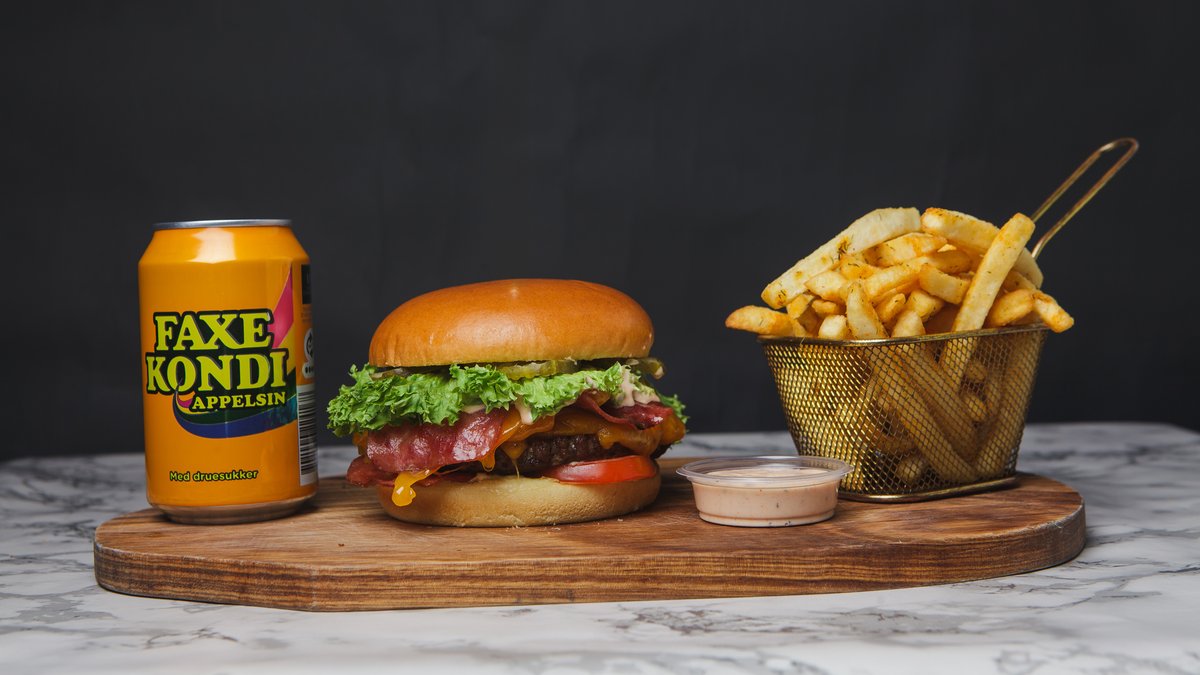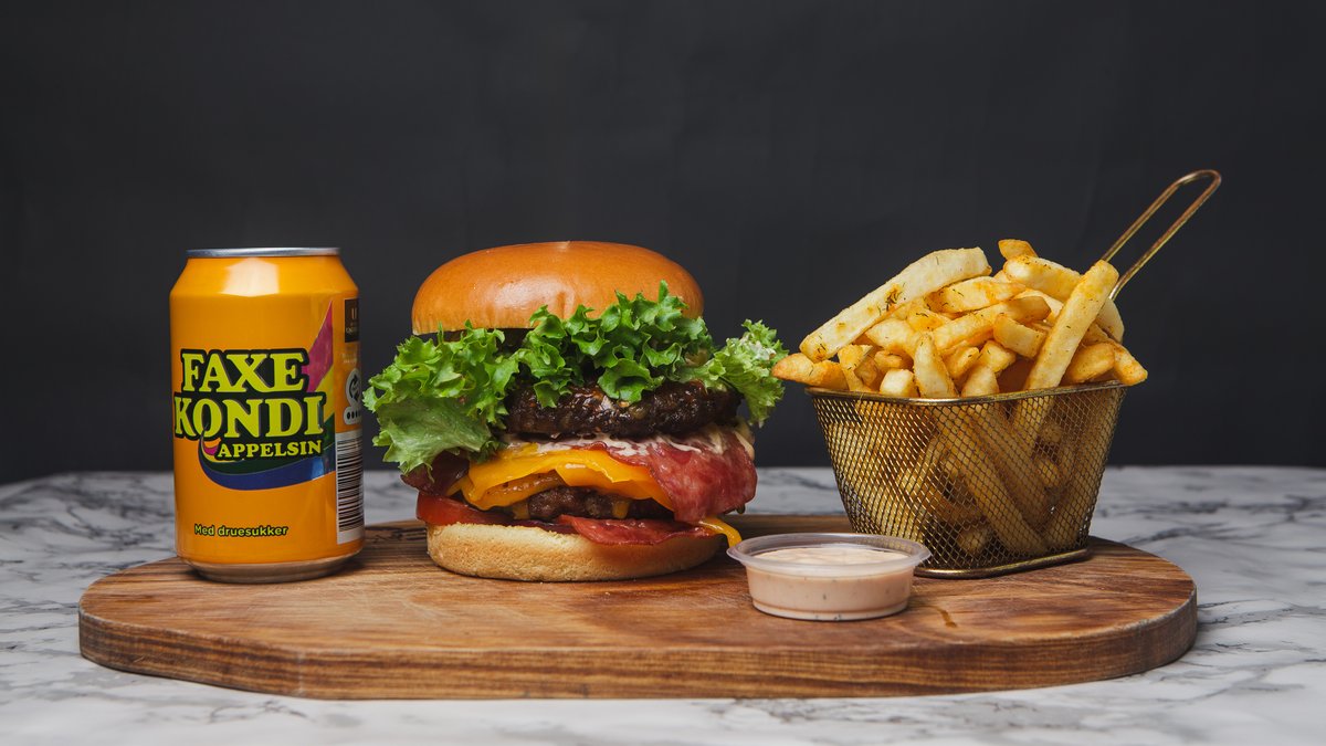 Bøf med speciel dressing fra USA, bacon, dobbelt ost, salat, tomat, agurk, dressing og løg. Serveres med pommes frites og valgfri sodavand.