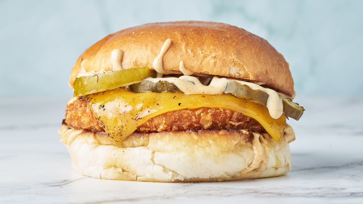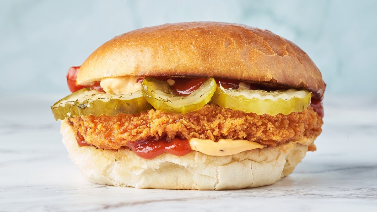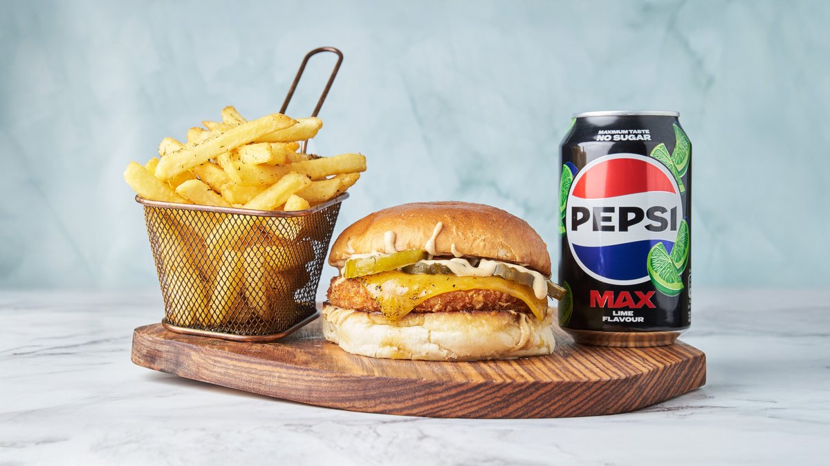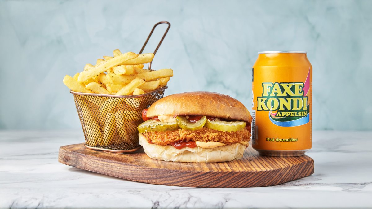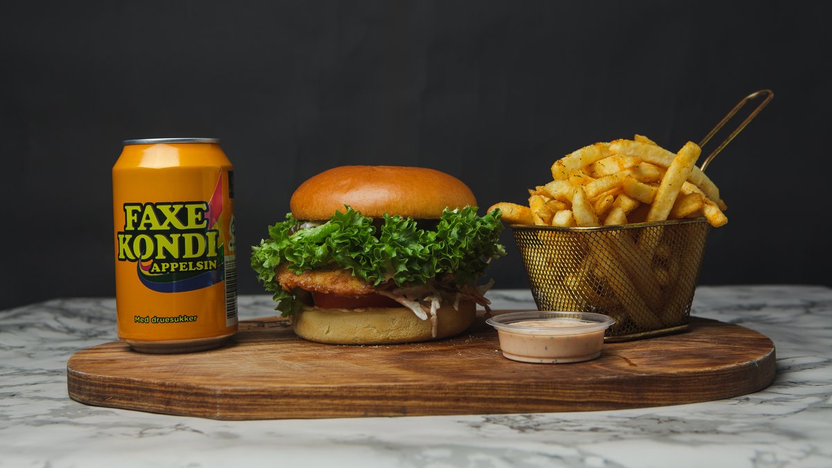 Sprød kylling, ost, pickles & mayo. Serveres med pommes frites og valgfri sodavand.