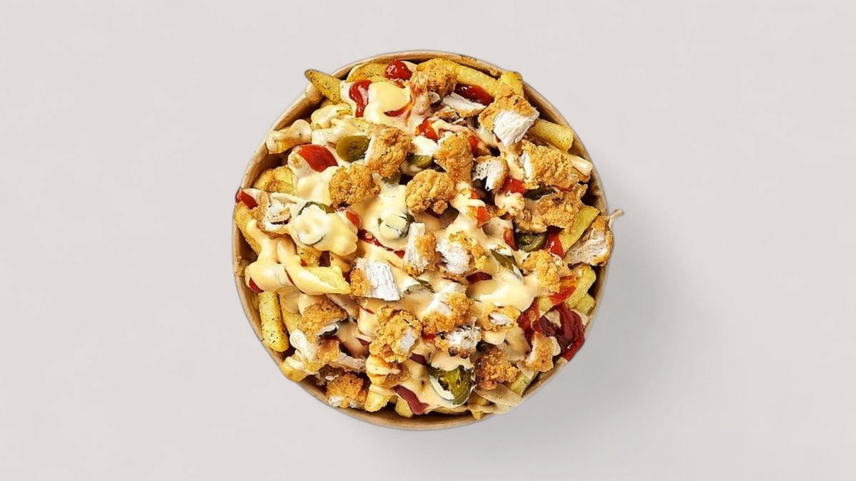 Pommes frites toppet med ostesauce, BBQ, hjemmelavet dressing og Jalapeños.