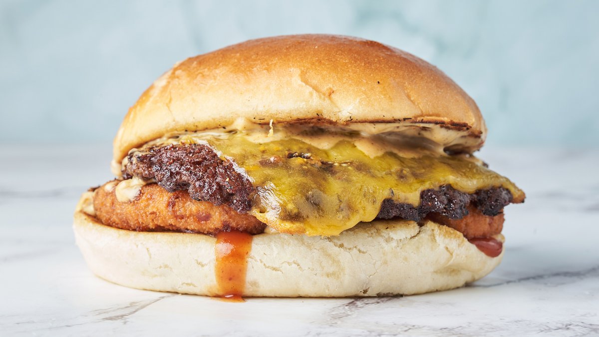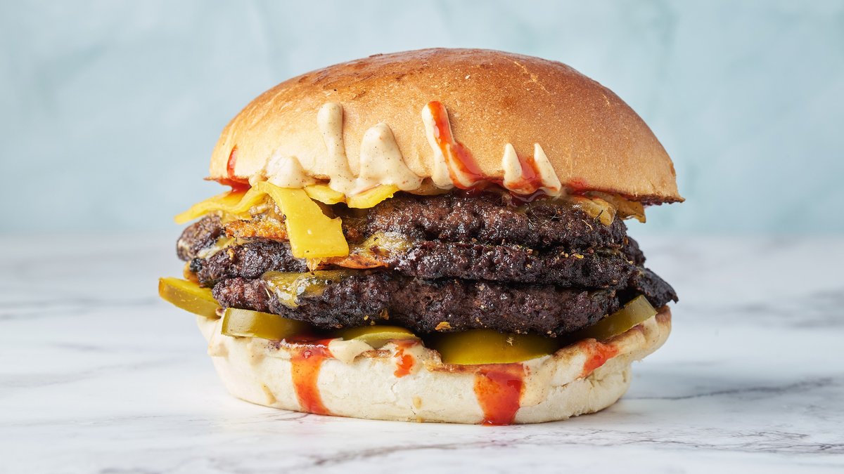 To smash-bøffer (240 g), dobbelt cheddar, jalapeños, frisk chili, chipotle-mayo & ekstrem stærk Dragon’s Breath Sauce.