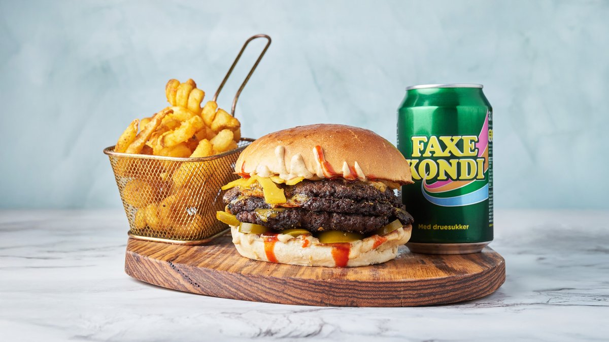To bøffer (240 g), dobbelt cheddar & ekstra saft. Serveres med pommes frites og valgfri sodavand.