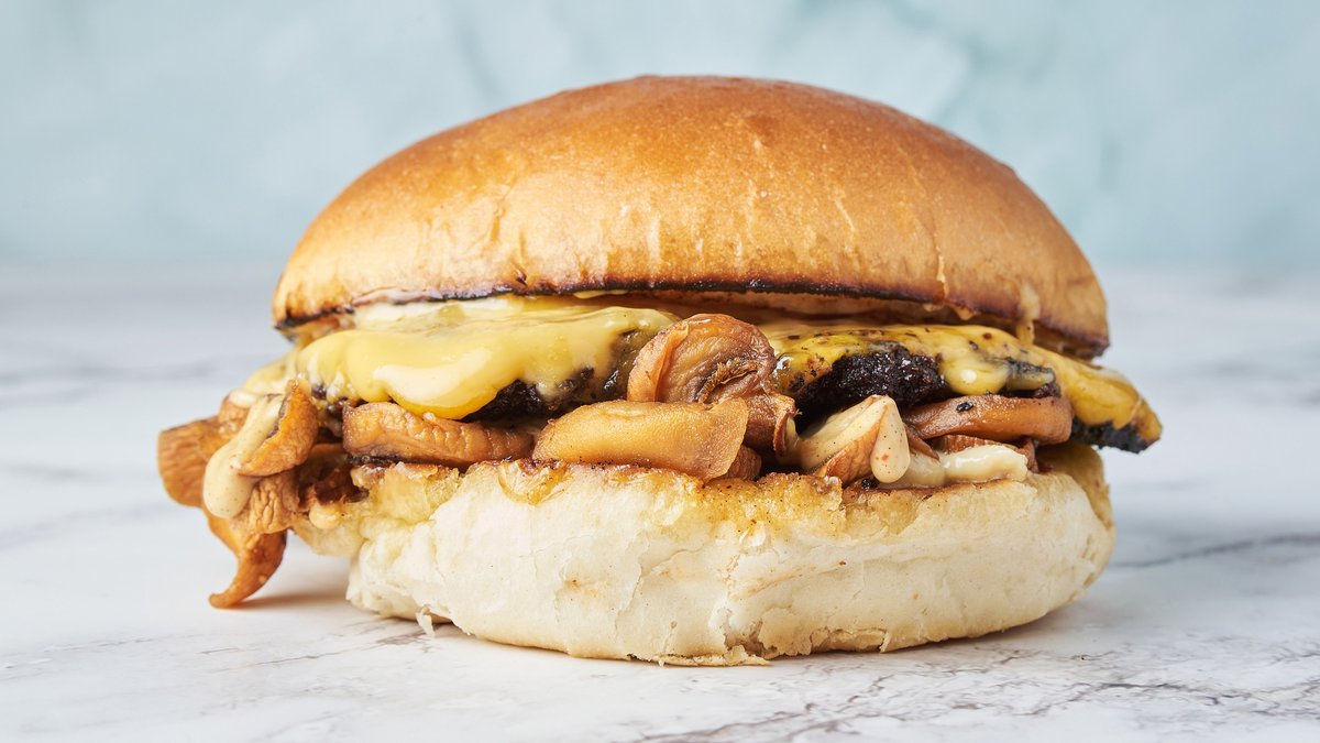 Smash-bøf (120 g), trøffelmayo, champignon & cheddarost.