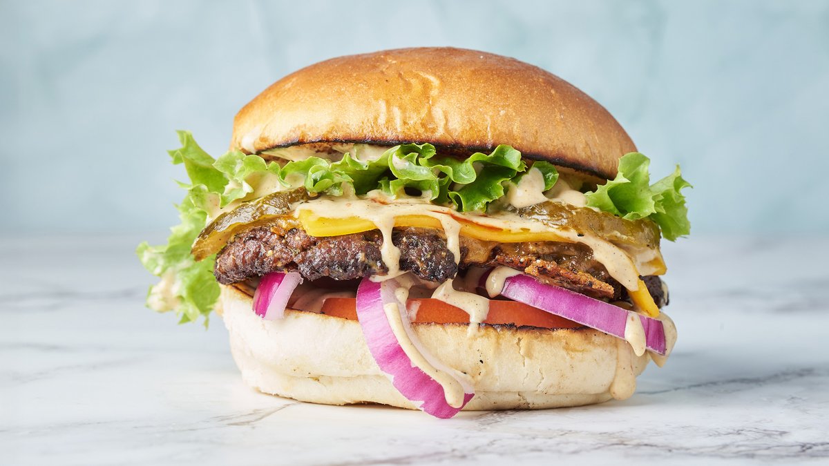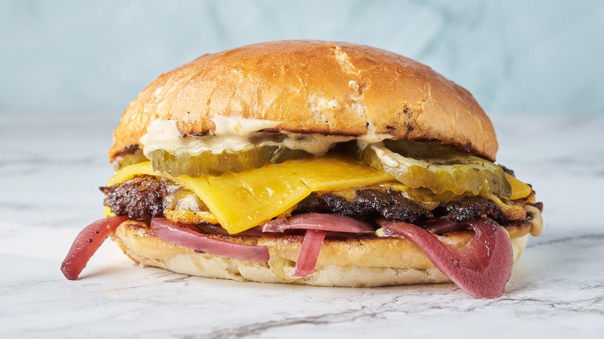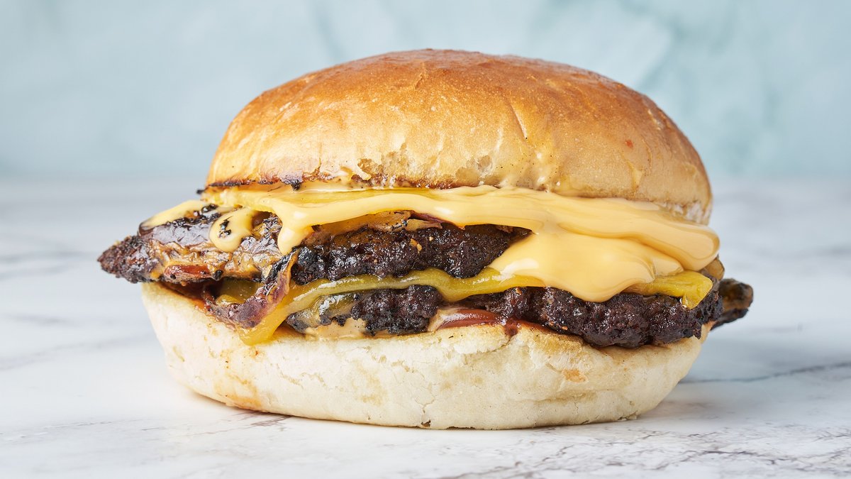 To saftige smash-bøffer (240 g), dobbelt cheddar, karamelliserede løg, pickles & Joey's sauce.
