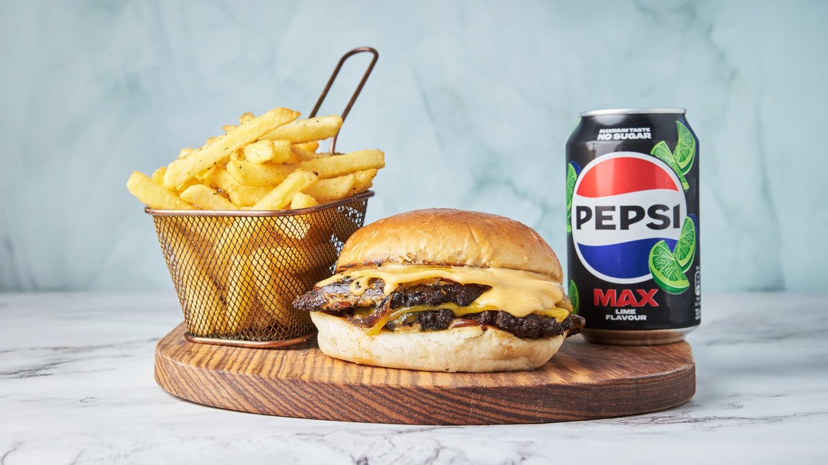 To saftige smash-bøffer (240 g), dobbelt cheddar, karamelliserede løg, pickles & Joey's sauce. Serveres med pommes frites og valgfri sodavand.