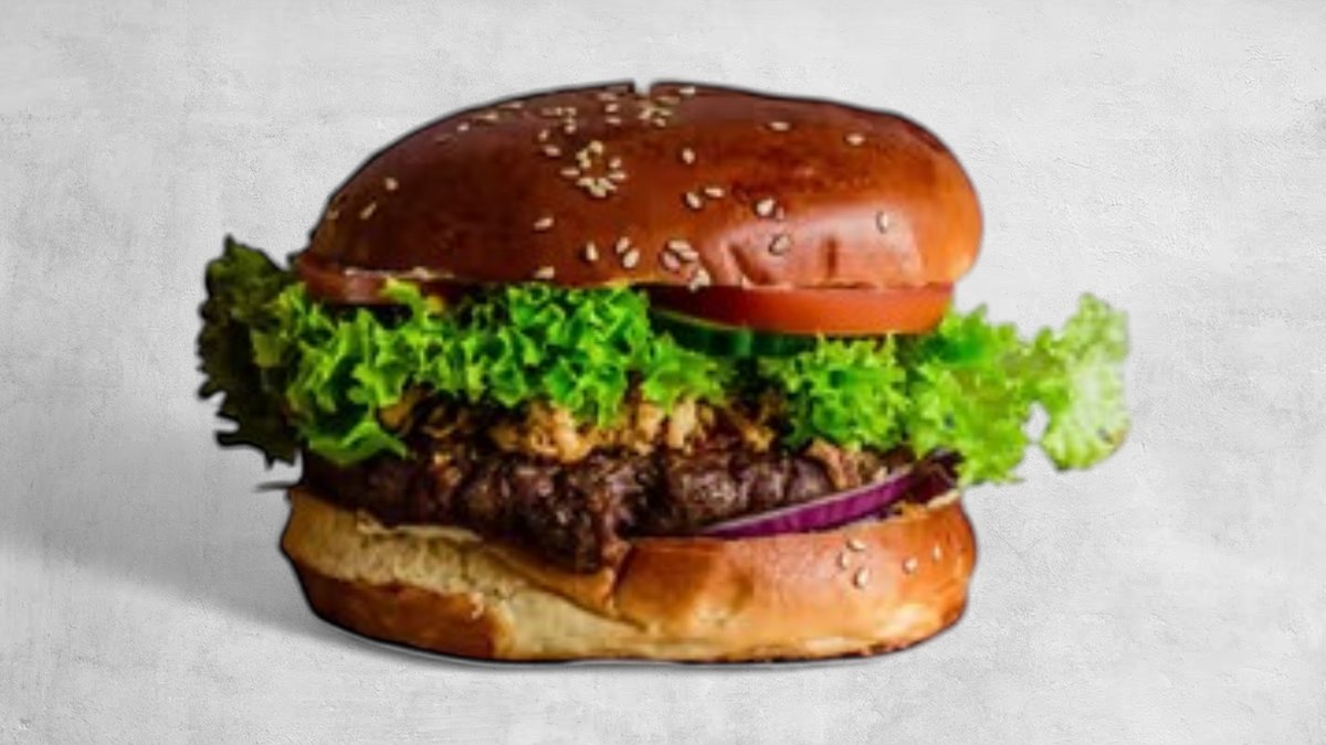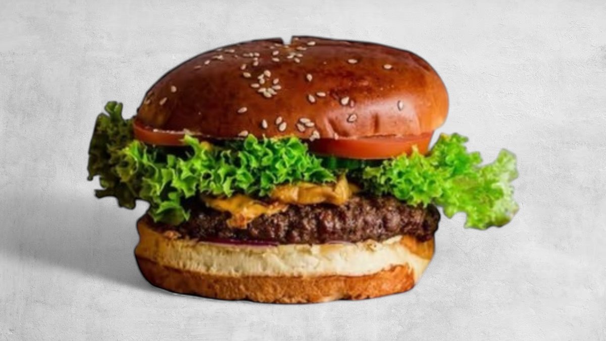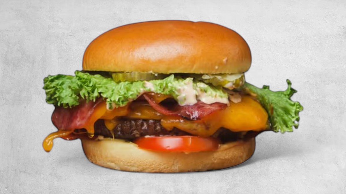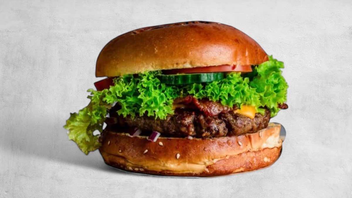 Bøf med speciel dressing fra USA, bacon, dobbelt ost, salat, tomat, agurk, dressing og løg.