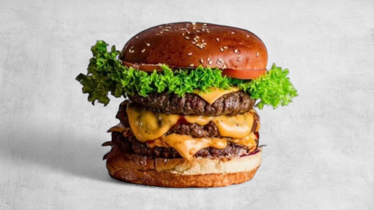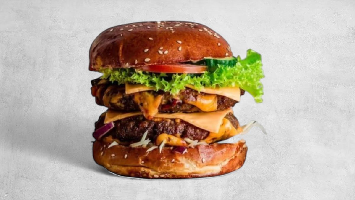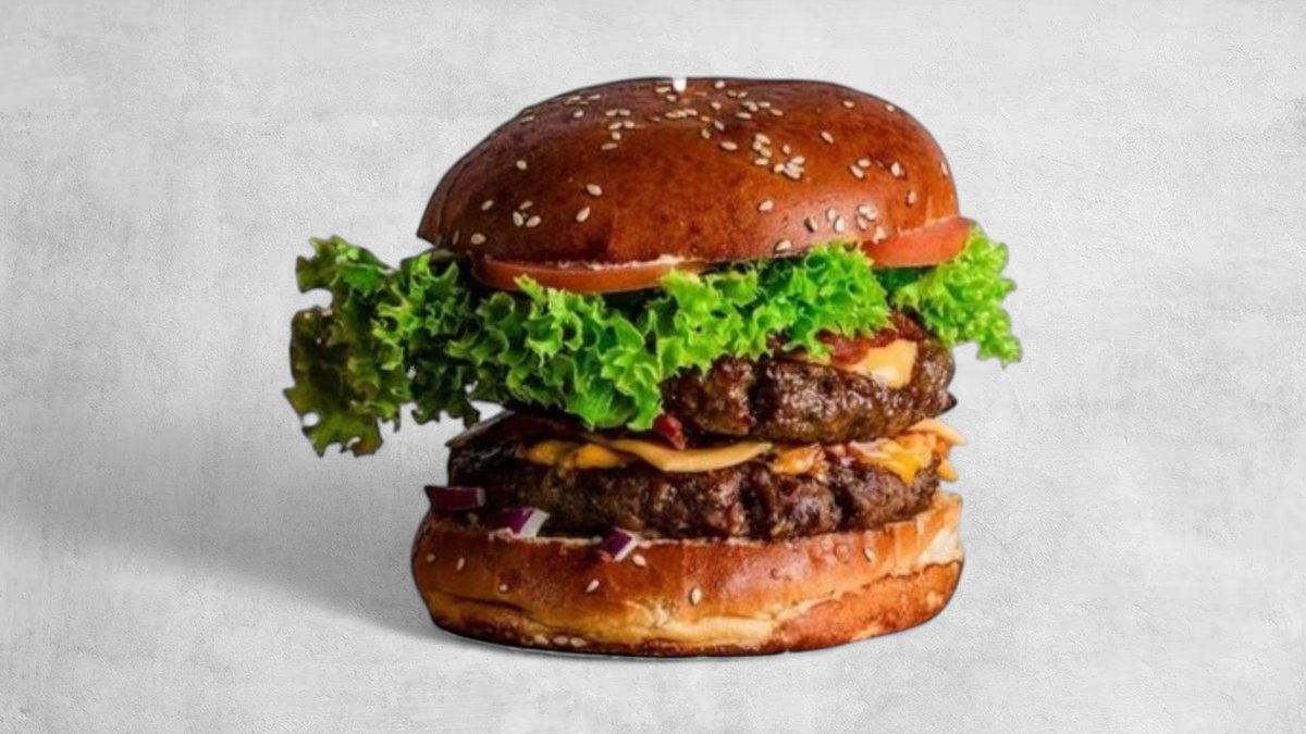 Bøf med dobbelt cheddarost, dobbelt bacon, salat, tomat, rødløg, agurk, mayonnaise og hjemmelavet dressing.