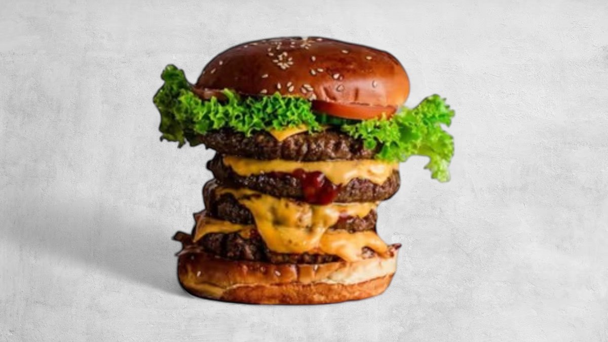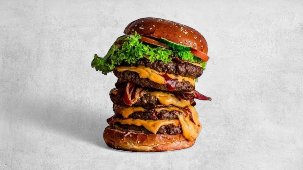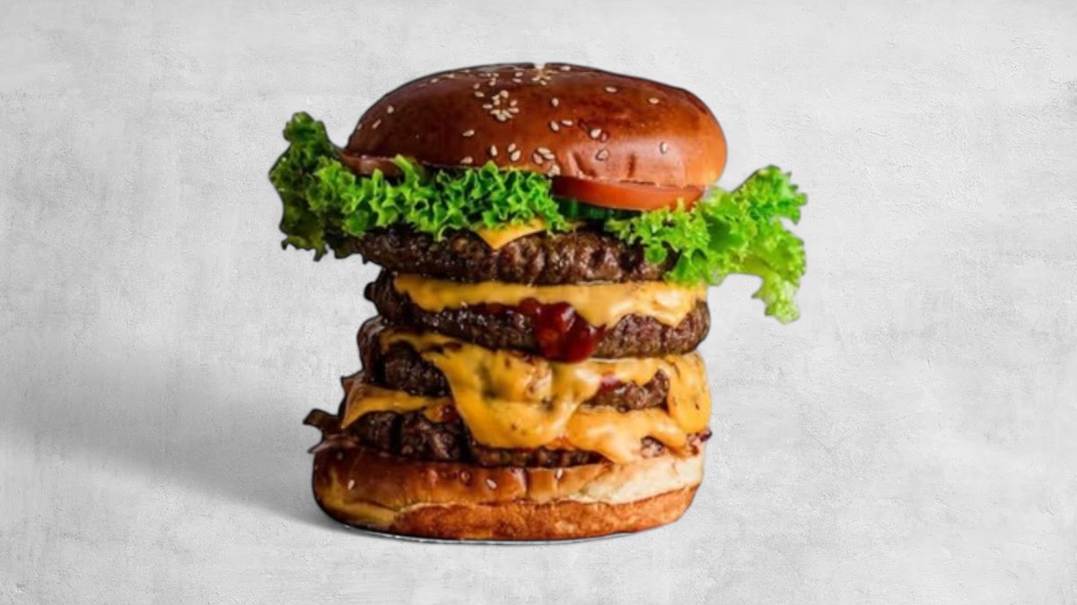 400 Gram bøf, dobbelt cheeseburger med Pepper Jack ost, bacon, mayonnaise, bbq sauce, tomat, løg, salat og agurk.