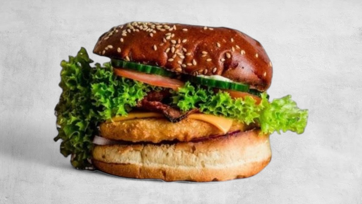 200 Gram kylling med dobbelt cheddarost, dobbelt bacon, salat, tomat, agurk, rødløg, mayonnaise og hjemmelavet dressing.
