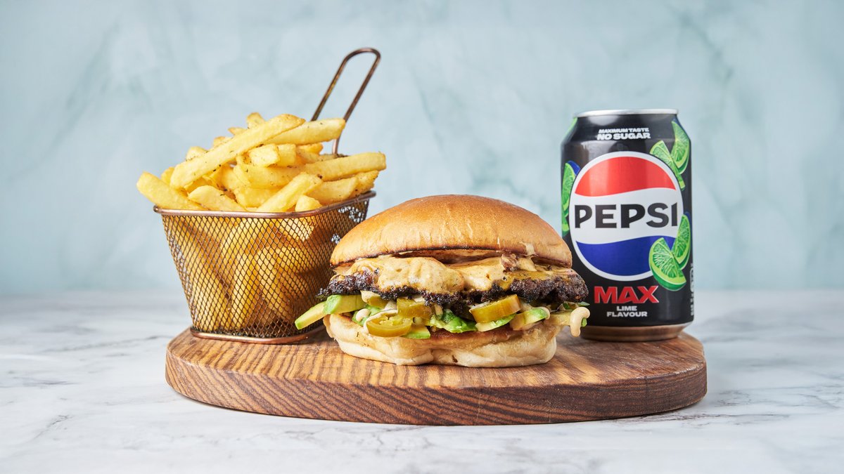 Oksekød (120 g), cheddar, jalapeños, chipotle-mayo & avocado. Serveres med pommes frites og valgfri sodavand.