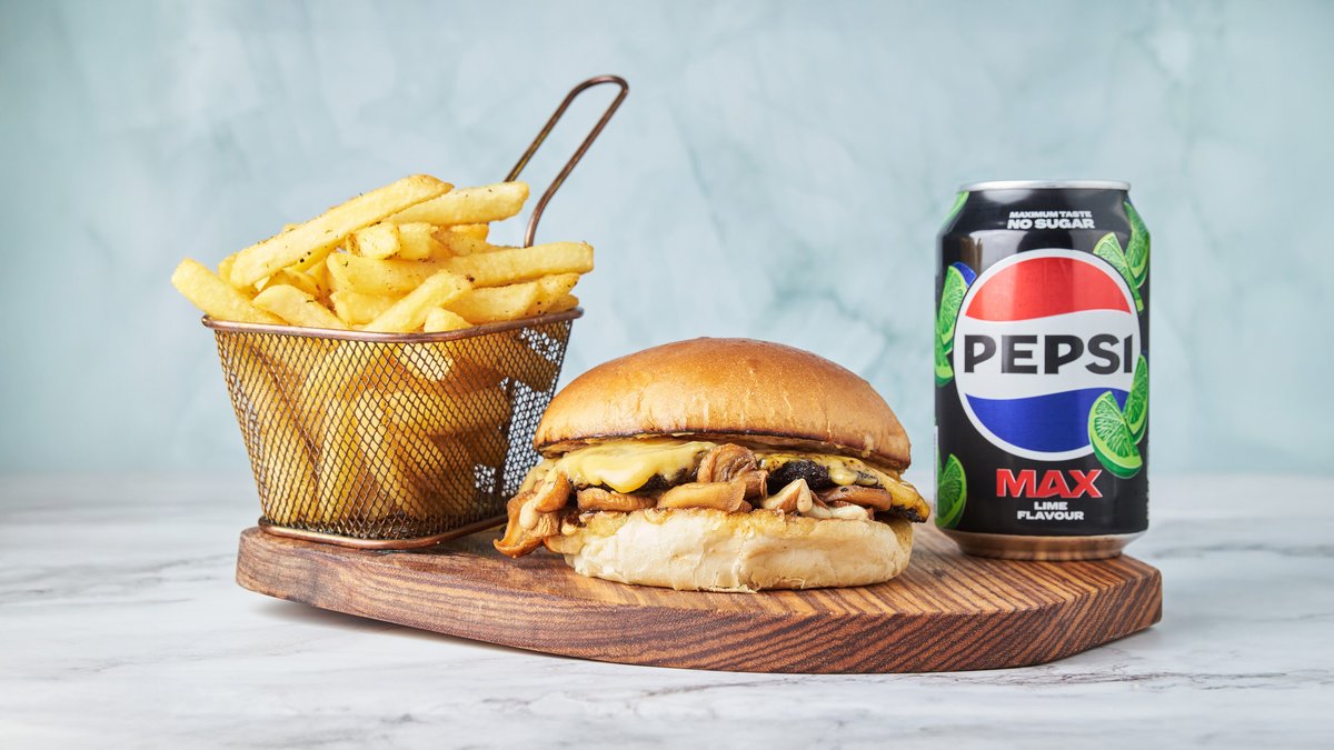 Smash-bøf (120 g), trøffelmayo, champignon & cheddarost. Serveres med pommes frites og valgfri sodavand.