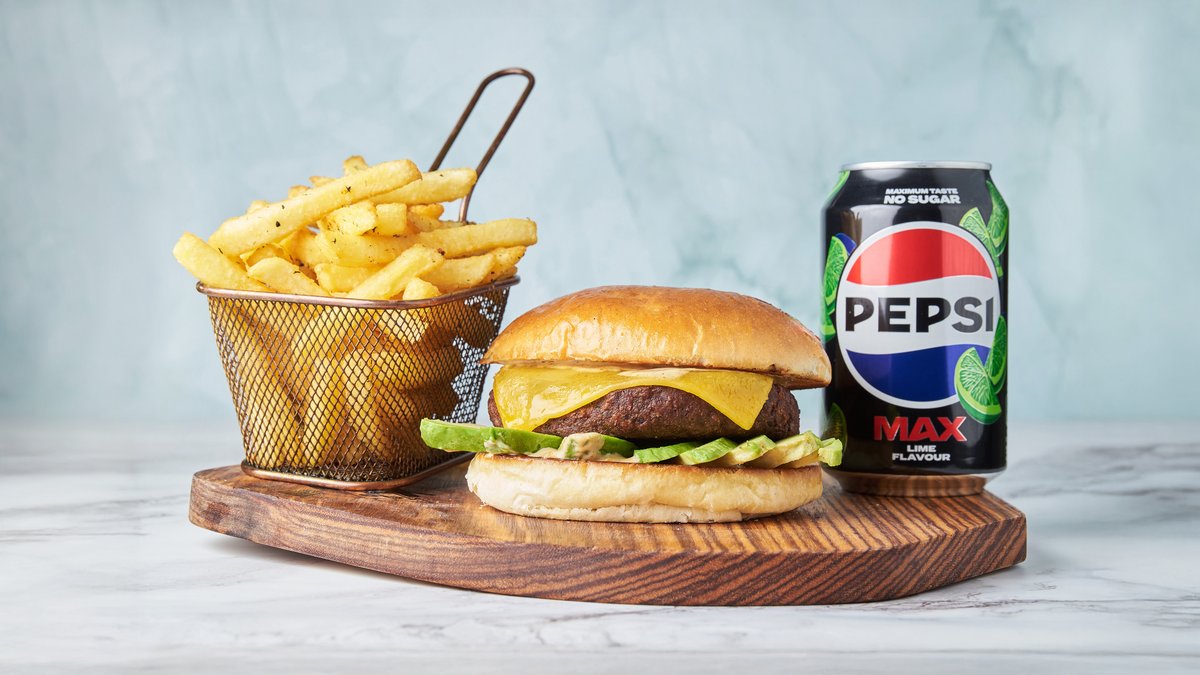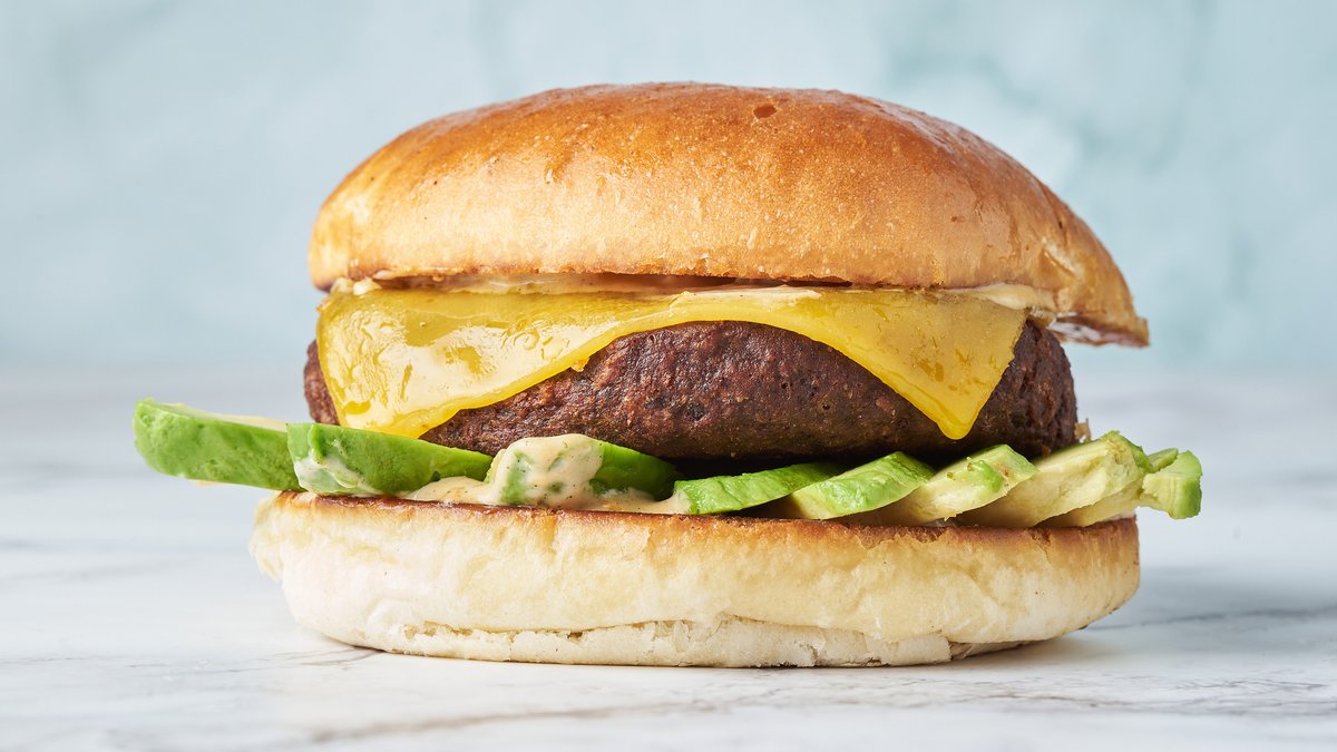 Plantebøf, avocado, cheddar & chili-mayo. Serveres med pommes frites og valgfri sodavand.