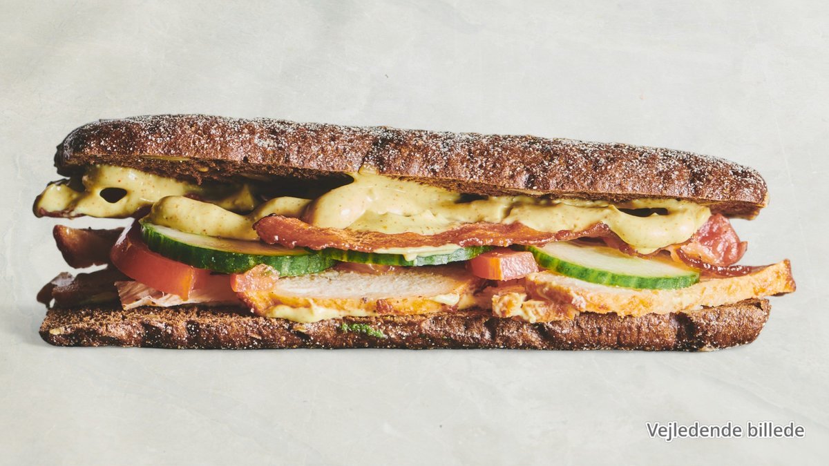 Kylling, bacon, iceberg, ost, tomat og agurk.