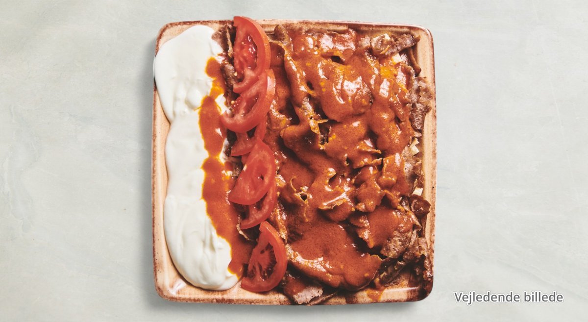 Kebab, yoghurt, tomatsauce, brød og salat.