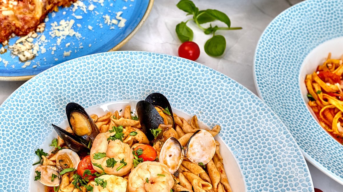 Valgfri pasta, skaldyr, cherrytomater, persille, hvidvin og hvidløgsolie. Serveres med scrocchiarella brød.