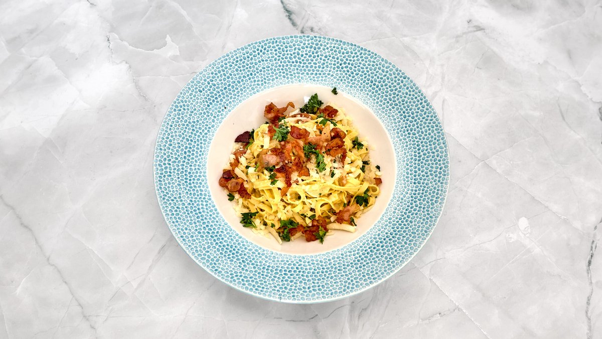 Valgfri pasta, guanciale, æg, parmesan, fløde og persille. Serveres med scrocchiarella brød.