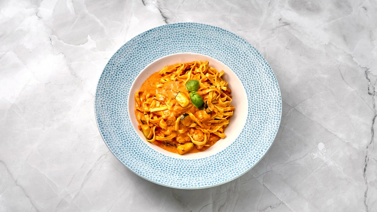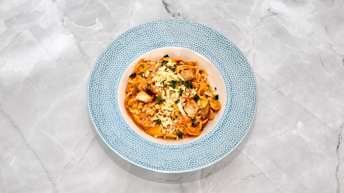 Valgfri pasta, kylling, løg, tomatsauce, gulerødder, fløde squash og pink sauce. Serveres med scrocchiarella brød.