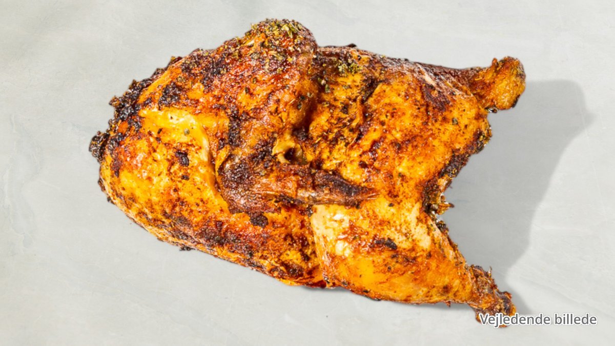 500 gram grillkylling med pommes frites, remoulade, salat og agurkesalat.