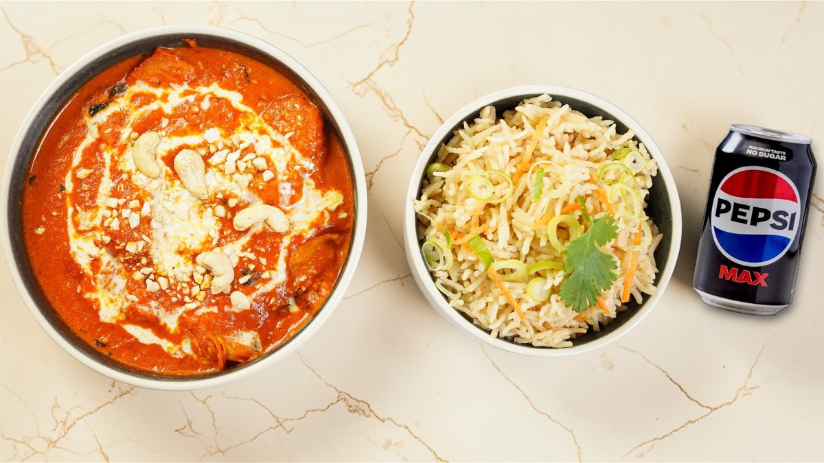 Medfølger en Pepsi Max 0,33 l. Smørkylling - Valgt protein i en cremet tomatsauce, krydret og vendt i smør med nødder. Serveres med ris, toppet med cashewnødder og creme. Klassisk indisk ret.