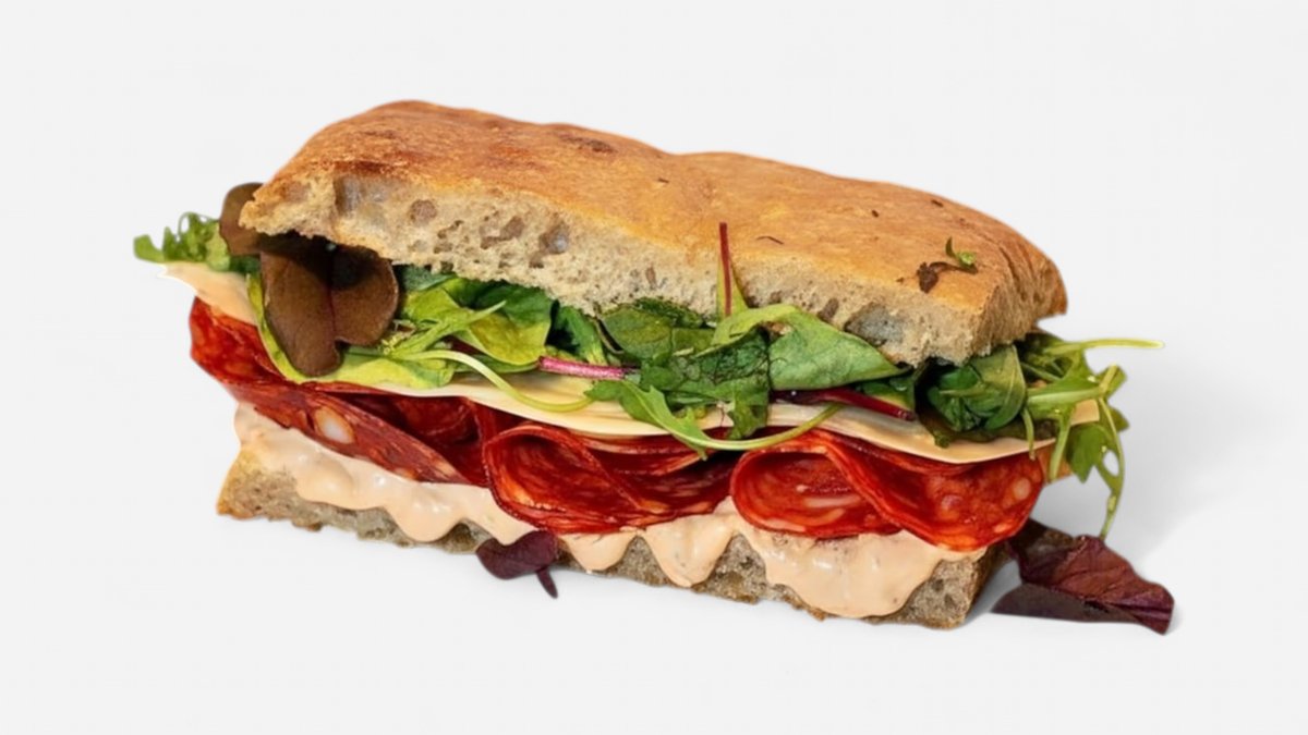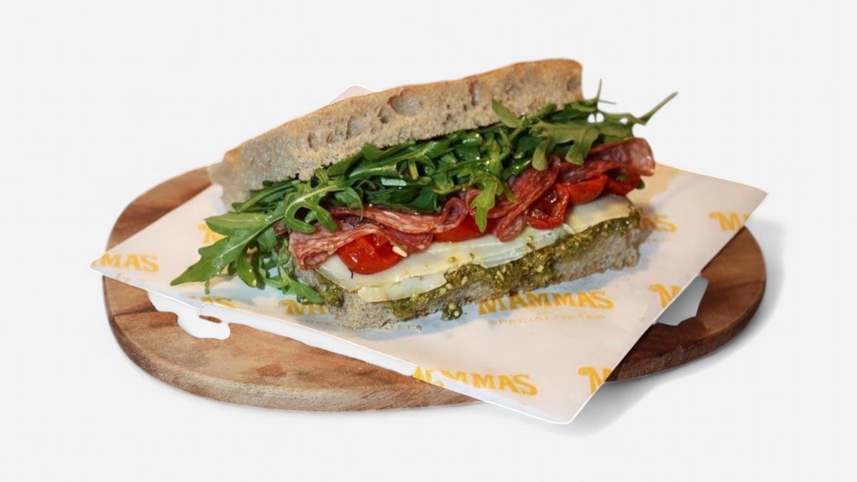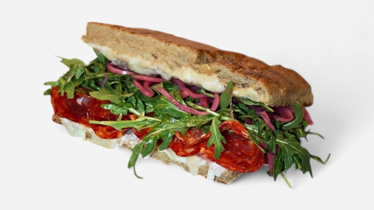 Ventricina, grana padano, aioli, syltede rødløg og mix salat.