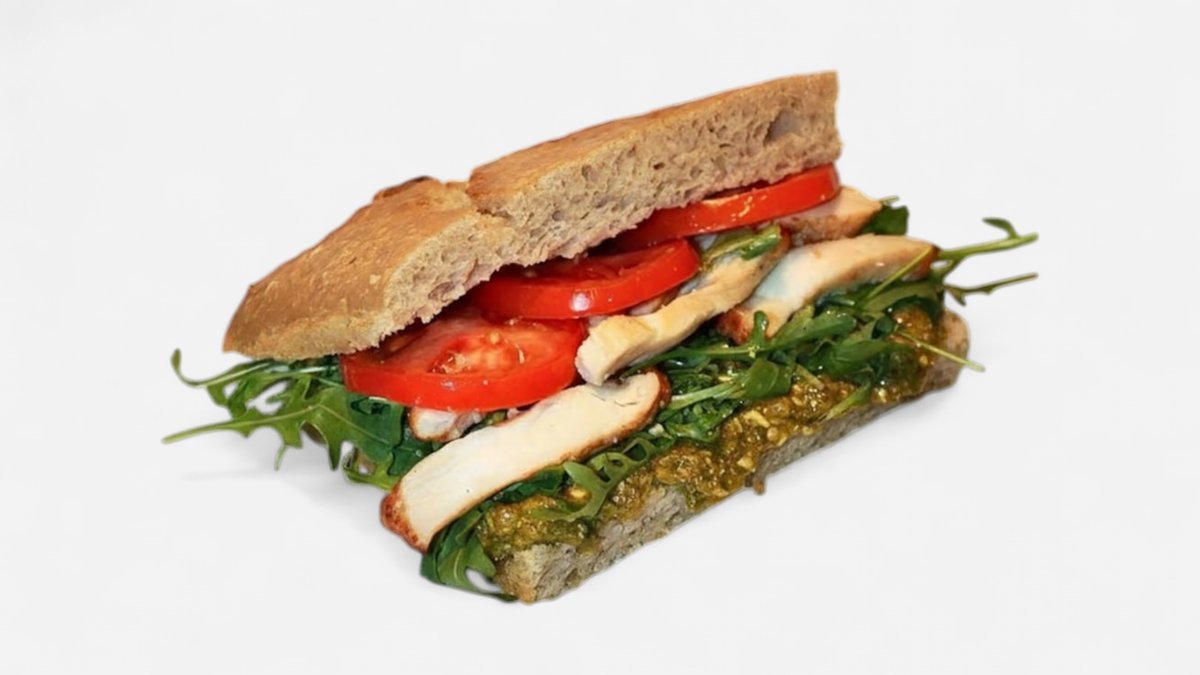 Brød med fyld af kylling, tomat, pesto, rucola og basilikum.