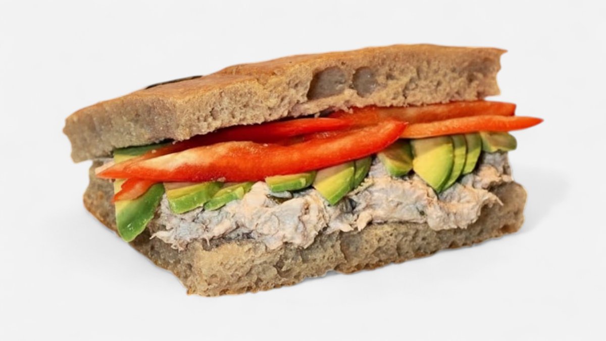 Brød med fyld af spicy tun, jalapeños, drueagurker, peberfrugt og avocado.
