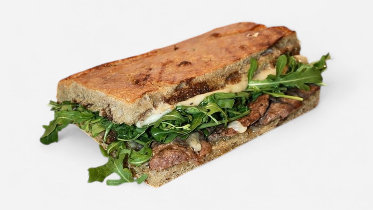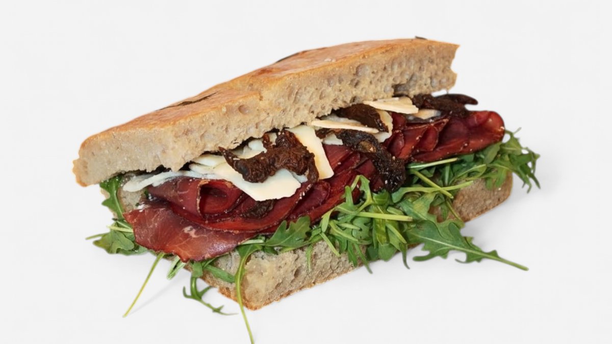 Brød med fyld af bresaola, grana padano, soltørrede tomater, peber, citronolie og rucola.