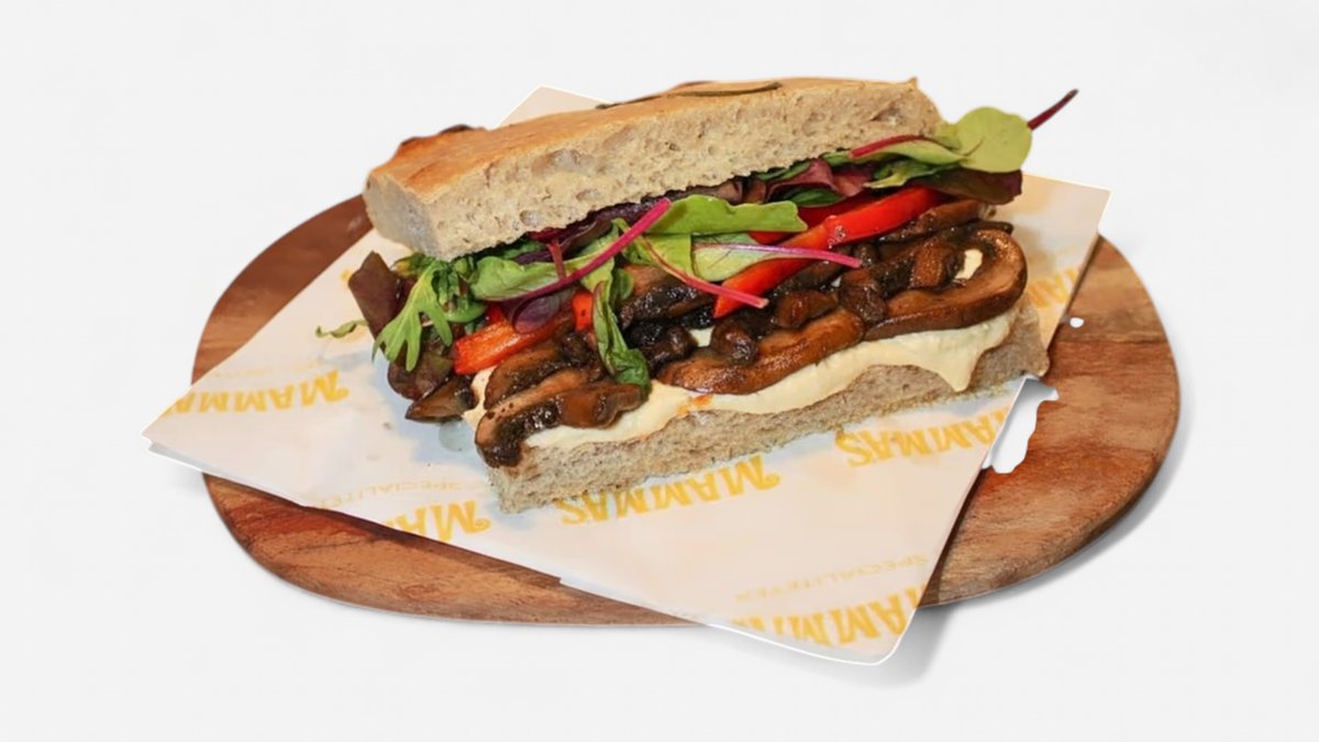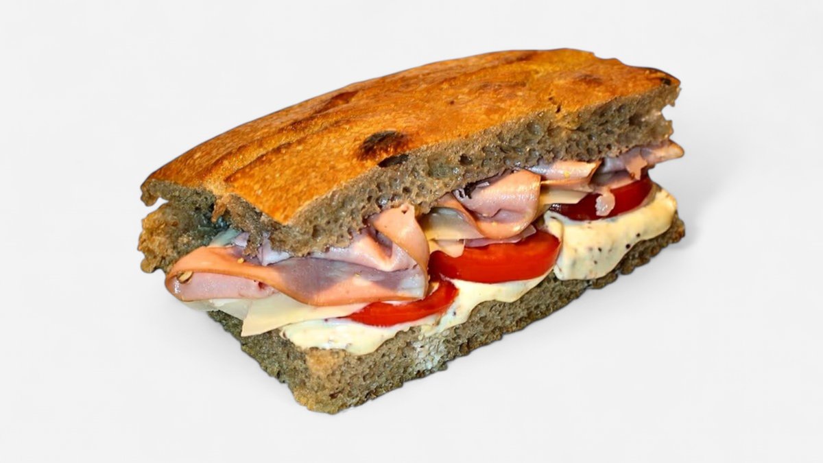 Brød med fyld af mortadella, provolone, tomat og dijonmayo.