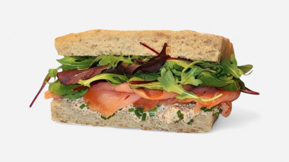 Brød med fyld af røget laks, purløg, nøddedressing og mix salat.