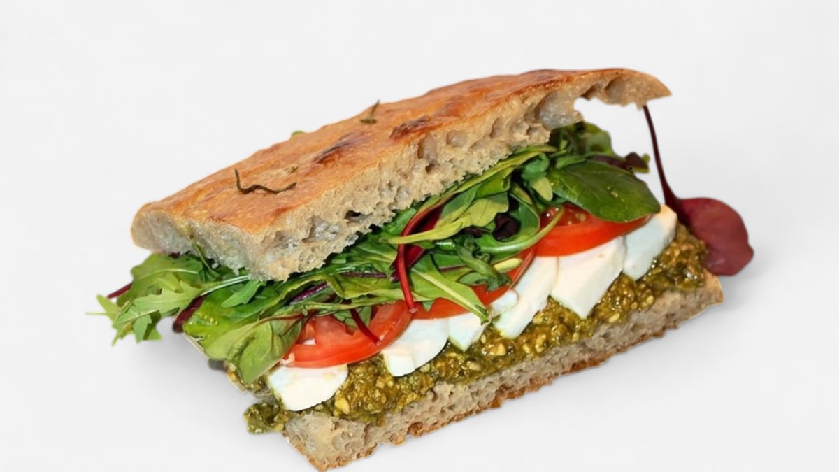 Brød med fyld af mozzarella, tomat, pesto, mix salat og basilikum.