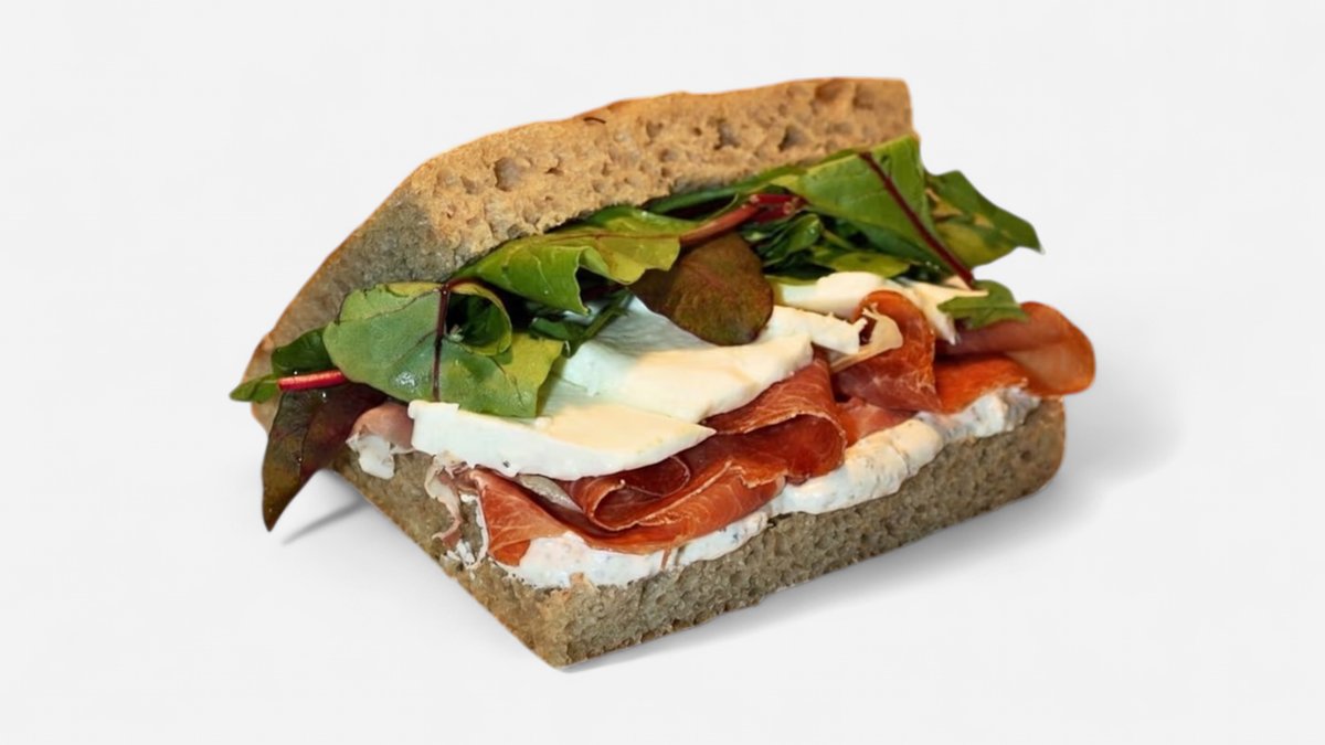 Brød med fyld af trøffelcreme, parmaskinke, mozzarella og mix salat.