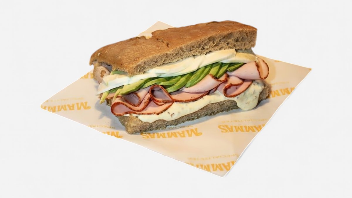 Brød med fyld af rosmarinskinke, avocado, mozzarella og dijonmayo.