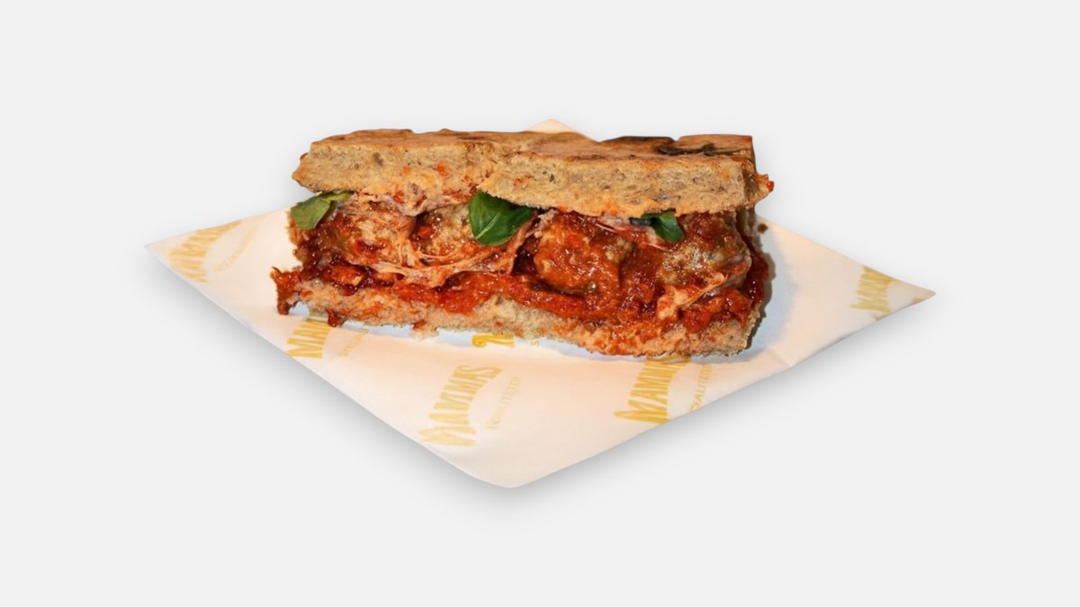 Brød med fyld af hjemmelavede kødboller, provolone, tomatsauce og basilikum.